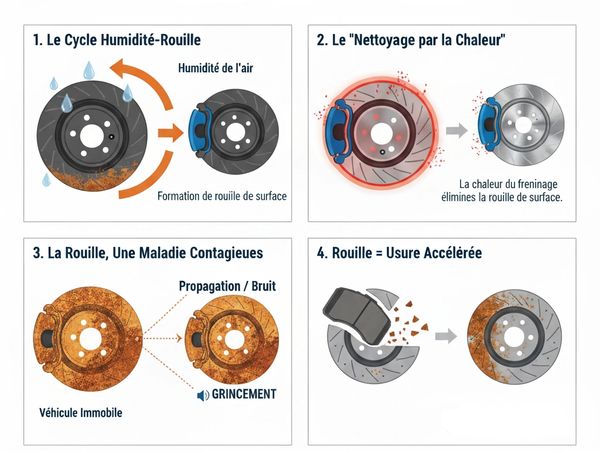 Le problème survient lorsque le véhicule reste immobile trop longtemps (plusieurs jours ou une semaine). La rouille de surface n'est pas "nettoyée" par la conduite. Au lieu de cela, elle a le temps de s'incruster plus profondément et de se propager. On peut dire que la rouille est "contagieuse" : plus elle s'installe, plus elle encourage d'autres parties du métal à rouiller.